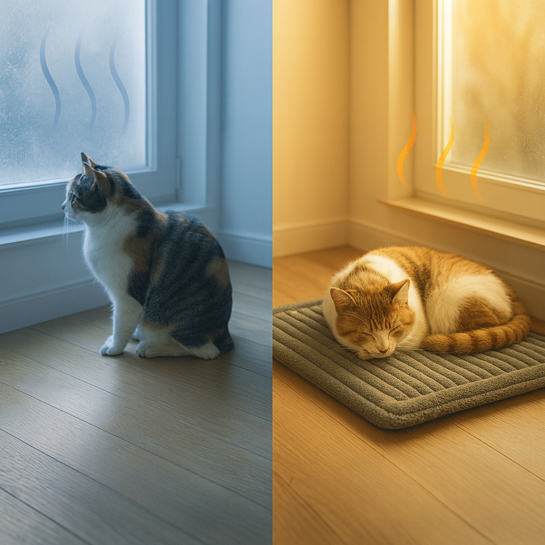 Cats and small dogs crave warm, quiet spots—but bare floors, crate pans, and window perches pull heat away fast. Noisy, sliding pads get ignored, so naps are short and fidgety.